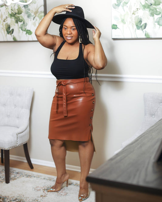 Lizzie PU Leather Slit Tied Ruched Buttoned Skirt