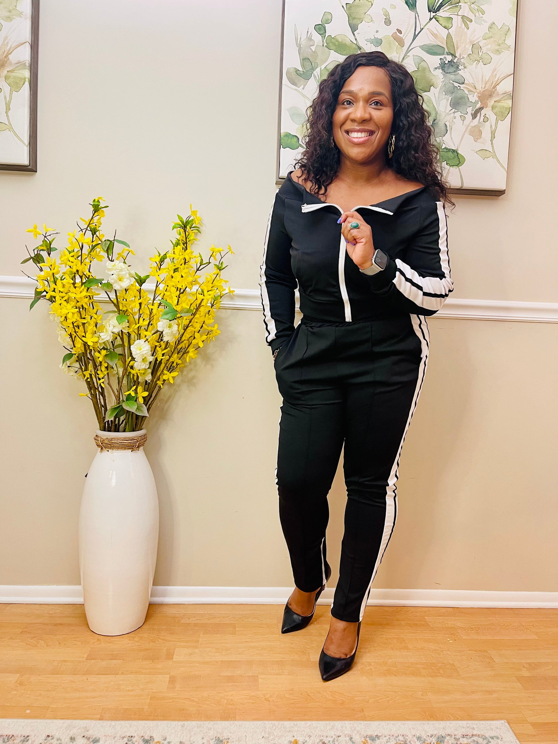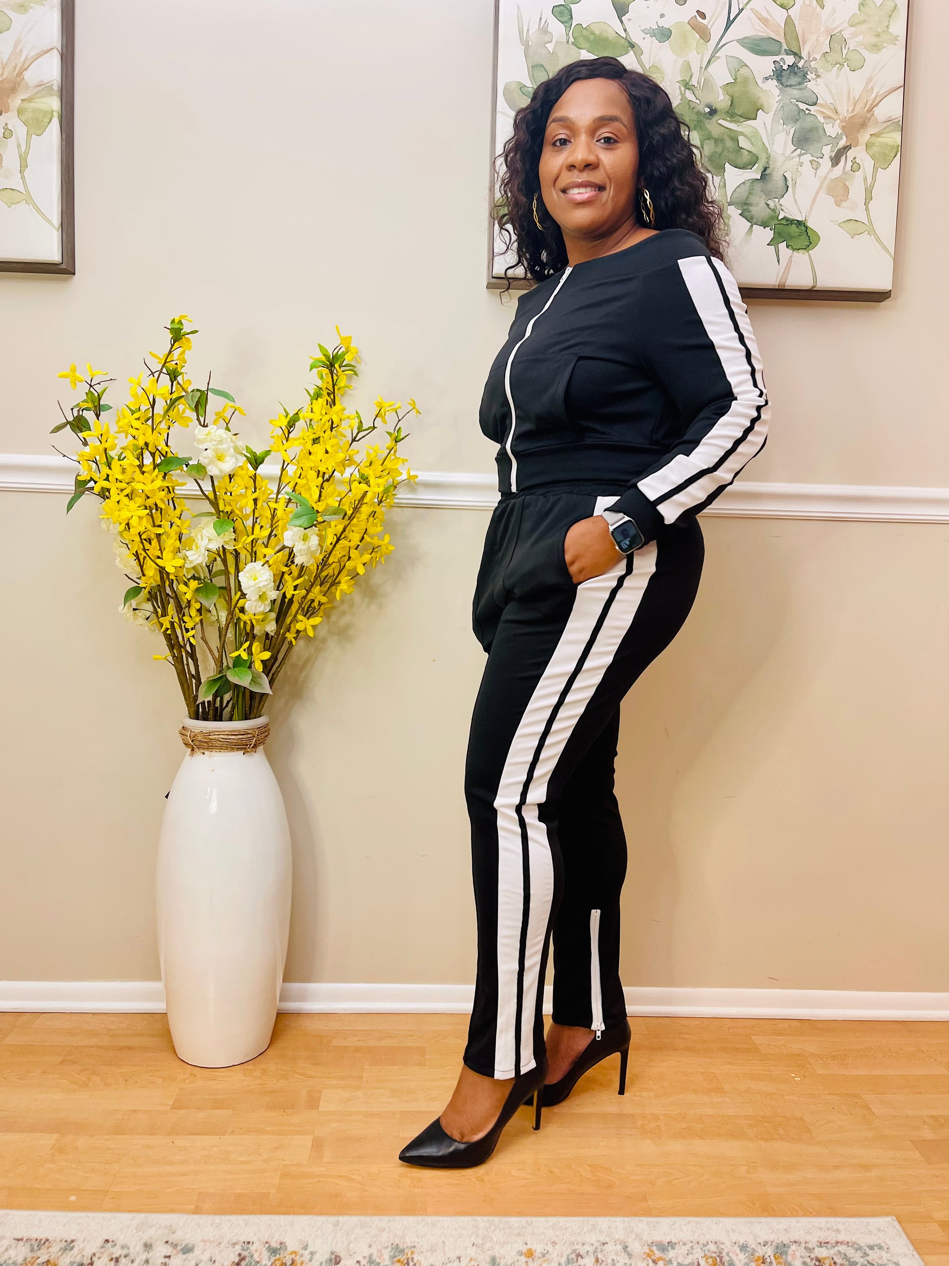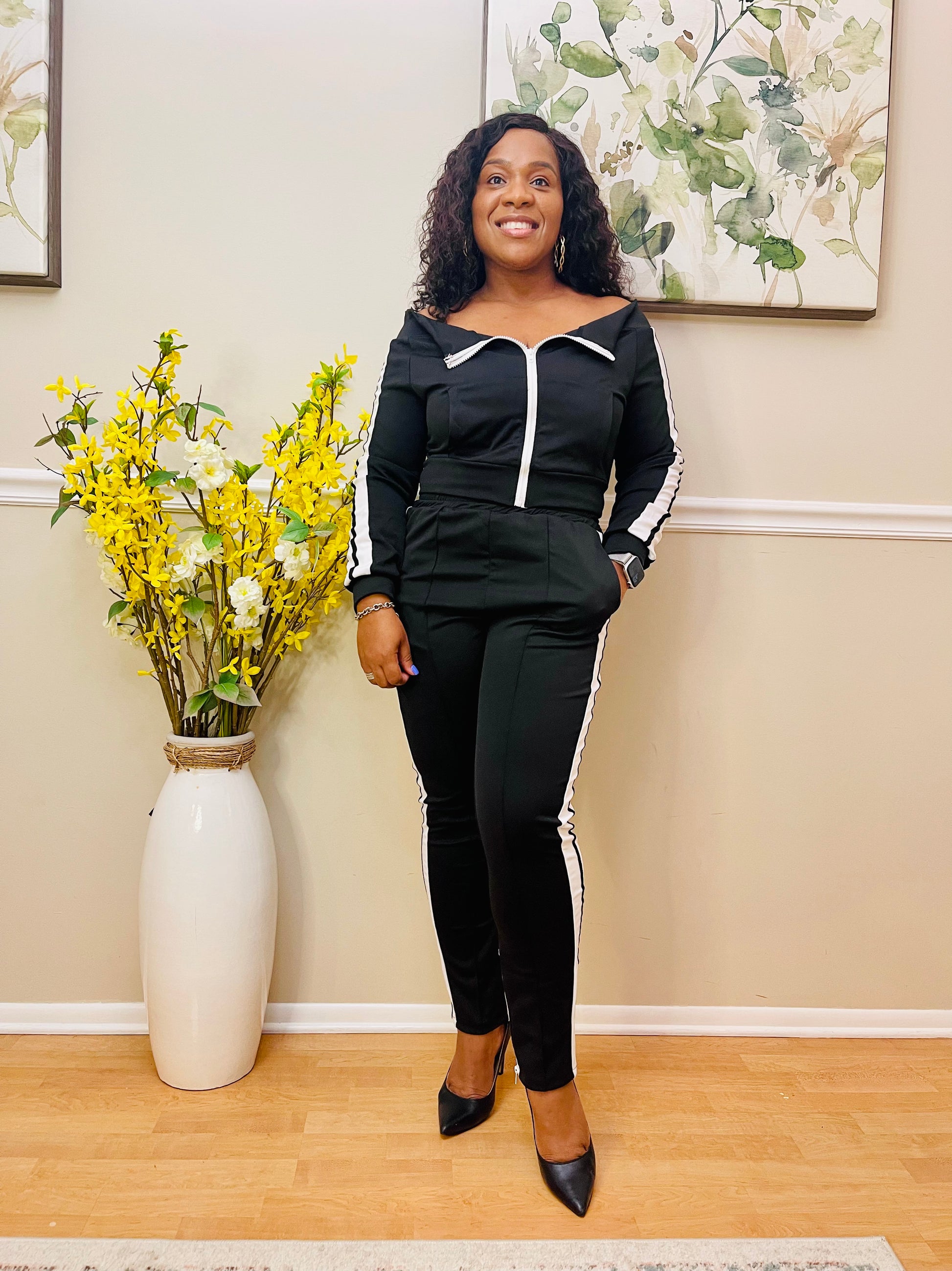 This black and white off the shoulder jogger set gives you best of both worlds. Soft material at the touch adorned by strips of on the sleeves and legs. Pants has pockets with a relaxed fit and elastic in the waist. The ankle has a zip for a classier look. 95% polyester 5% spandex. True to size. Has stretch.